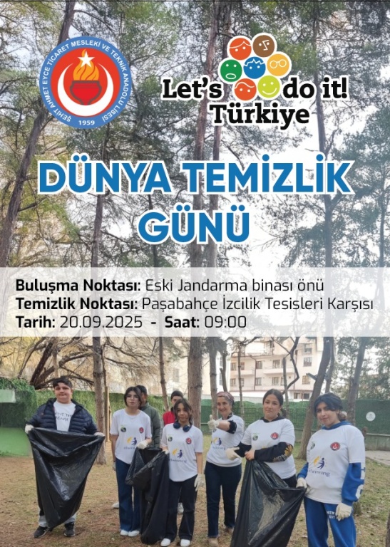 Dünya çapında çevre bilincini artırmak amacıyla, 20-21 Eylül tarihlerinde düzenlenen çevre temizliği etkinliğine, okulumuz Şehit Ahmet Eyce Ticaret Meslekî ve Teknik Anadolu Lisesi olarak öğrencilerimizle birlikte katıldık. Bu etkinlik, doğanın korunması ve çevre kirliliğinin önlenmesi konusundaki duyarlılığı artırmak adına önemli bir adım oldu. Öğrencilerimizin katılımıyla gerçekleştirdiğimiz çevre temizliği etkinliği, atıksız bir dünya için atılacak ilk adımlardan biri olarak büyük anlam taşıdı.